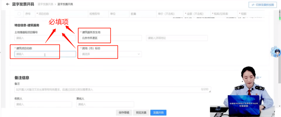 1、銷售方在開具建筑服務(wù)發(fā)票時(shí),數(shù)電票票面設(shè)定特定欄次,備注欄在其中,開具過程中這些特定欄次必須填寫,否則發(fā)票就開不出來;只是開出來不在“備注欄”顯示,在票面其他地方顯示。