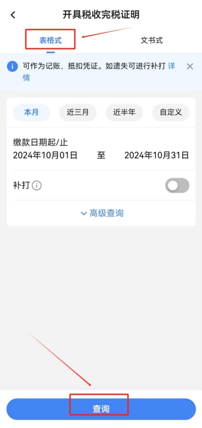 返回首頁,點擊“開具稅收完稅證明”,選中“表格式”后點擊下方“查詢”。