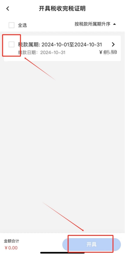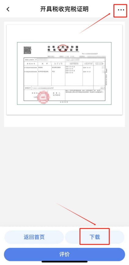 在查詢結(jié)果中勾選本次繳納的單筆稅款,點擊“開具”,即可查看并下載完稅證明(如有需要,您可點擊完稅證明預(yù)覽頁面右上角“...”將發(fā)票分享至對方)。