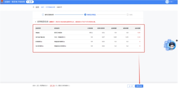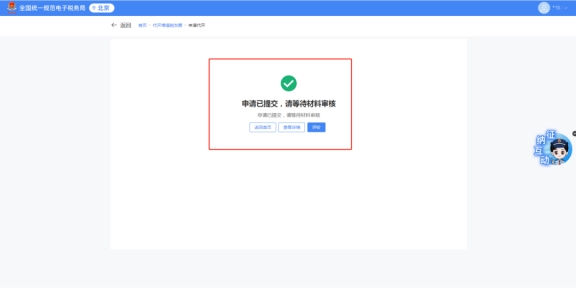確認系統(tǒng)自動計算的應(yīng)納稅費信息,無誤后點擊“提交”,顯示“提交成功”后等待稅務(wù)機關(guān)審核即可(稅務(wù)機關(guān)將在半個工作日內(nèi)完成審核,屆時您可按照下方流程查看已提交的申請的審核狀態(tài)并進行后續(xù)操作)。