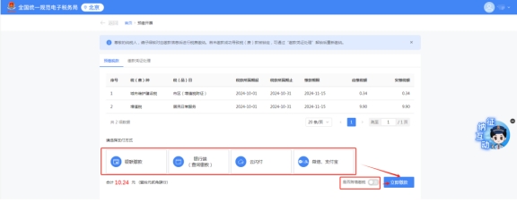 進入繳稅頁面后,可以看見需要繳納的稅款明細及支付方式,目前支付方式包含銀聯(lián)繳費、銀行端(查詢繳款)、云閃付、微信、支付寶等方式。也可以跨境繳稅。選擇完方式后,點擊立即繳款。