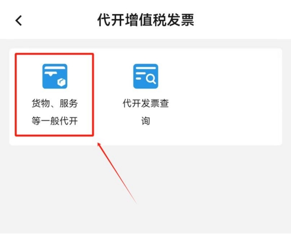 點擊“貨物、服務(wù)等一般代開”(目前移動端APP尚不支持房屋出租發(fā)票代開,如有需要您可通過電腦端線上辦理,具體操作步驟請查看個人代開房屋發(fā)票,新電子稅局的操作流程來啦!)。