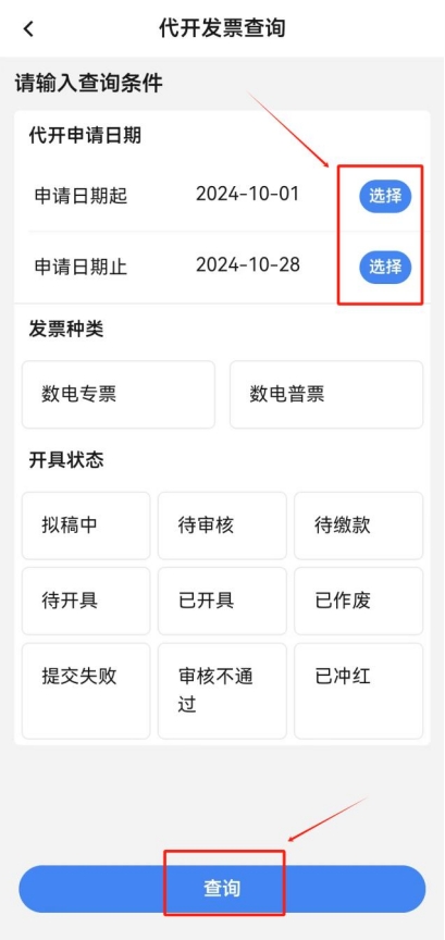 點擊首頁“代開增值稅發(fā)票”,點擊“代開發(fā)票信息查詢”,選擇提交申請的起止日期,點擊頁面下方的“查詢”。