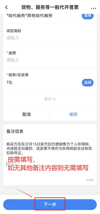 點擊“項目信息”一欄中的“添加項目信息”,“項目編號名稱”選擇“*現(xiàn)代服務(wù)*其他現(xiàn)代服務(wù)”,“項目簡稱”按需據(jù)實填寫(例如:勞務(wù)費/講課費等),“金額”據(jù)實填寫開票金額,“稅率/征收率”選擇“1%”,點擊“展開”可填寫更多信息,可根據(jù)開票需求自行選擇填寫(非必填項),填寫完成后點擊“保存”。