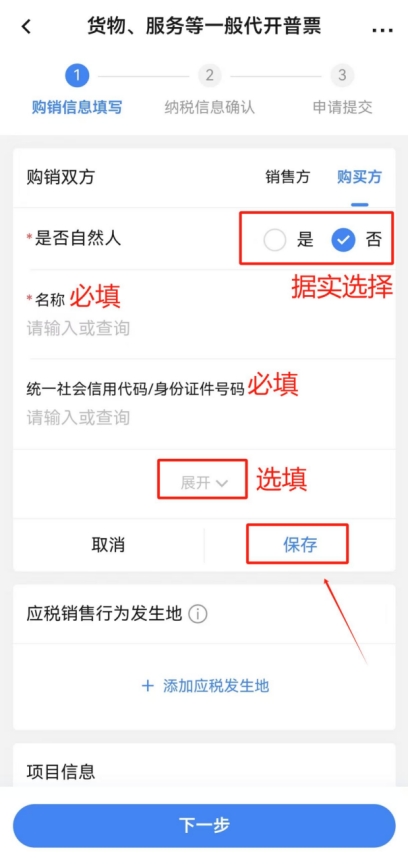 點擊“購銷雙方”一欄中的“銷售方”,核驗個人身份信息是否正確(銷售方僅能為登錄APP的用戶本人),無誤后點擊“購買方”,點擊“添加購買方”,根據(jù)實際情況選擇“是否為自然人”并填寫“名稱”及“統(tǒng)一社會信用代碼/身份證件號碼”(點擊“展開”可填寫更多信息,可根據(jù)開票需求自行選擇填寫,非必填項),填寫完成后點擊“保存”。