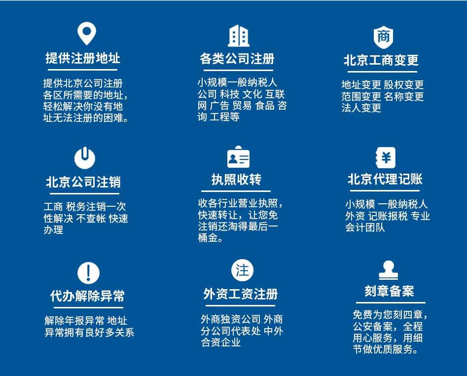 北京注冊公司流程及費(fèi)用我都整理好啦!代辦個(gè)體公司營業(yè)執(zhí)照辦理,提供北京公司注冊地址,正規(guī)公司注冊代辦代理記賬公司,公司變更,股權(quán)變更,公司注銷轉(zhuǎn)讓一站式優(yōu)質(zhì)服務(wù)。