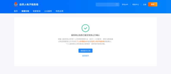 如果受讓方為自然人,需要其在個(gè)人所得稅APP或者自然人電子稅務(wù)局(WEB端)查看并確認(rèn)信息;如果受讓方是企業(yè),則需要其在扣繳客戶端或通過(guò)自然人電子稅務(wù)局網(wǎng)頁(yè)端扣繳功能查看并確認(rèn)信息。