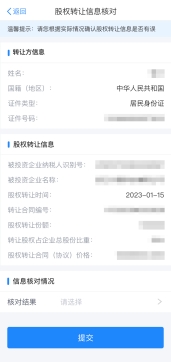 受讓方應(yīng)認(rèn)真核對(duì)股權(quán)轉(zhuǎn)讓信息,核對(duì)完成后選擇“核對(duì)結(jié)果”。若“核對(duì)無(wú)誤”則直接點(diǎn)擊“提交”,若選擇“核對(duì)有誤”則應(yīng)填寫(xiě)相應(yīng)原因后點(diǎn)擊“提交”。對(duì)于受讓方確認(rèn)不通過(guò)的,納稅人需根據(jù)受讓方反饋信息進(jìn)行修改,并重新提交至受讓方確認(rèn);對(duì)于受讓方確認(rèn)通過(guò)的,會(huì)自動(dòng)轉(zhuǎn)入稅務(wù)機(jī)關(guān)受理審核環(huán)節(jié)。