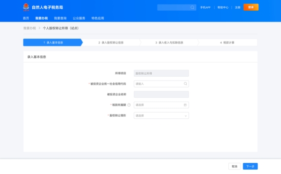 申報(bào)界面分為四個(gè)步驟,首先是錄入基本信息,在系統(tǒng)中錄入被投資企業(yè)統(tǒng)一社會(huì)信用代碼,選擇稅款所屬期、股權(quán)轉(zhuǎn)讓情形等。其次是錄入股權(quán)轉(zhuǎn)讓信息,該部分由“被投資企業(yè)信息”“股權(quán)轉(zhuǎn)讓方信息”“股權(quán)受讓方信息”及“附報(bào)資料”四部分組成,點(diǎn)擊“被投資企業(yè)信息”右側(cè)的“填寫(xiě)”,進(jìn)入填寫(xiě)頁(yè)面。