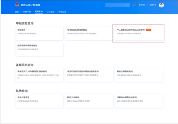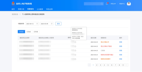 在自然人電子稅務(wù)局(WEB端)“我要查詢”——“個(gè)人股權(quán)轉(zhuǎn)讓資料報(bào)送記錄查詢”模塊可以查看主管稅務(wù)機(jī)關(guān)對(duì)股權(quán)轉(zhuǎn)讓材料的審核進(jìn)度。