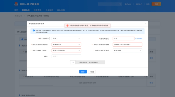 點(diǎn)擊“股權(quán)受讓方信息”右側(cè)的“填寫(xiě)”,進(jìn)入填寫(xiě)頁(yè)面。選擇受讓方類型,填報(bào)股權(quán)受讓方相關(guān)信息。這里需要注意的是,如果受讓方為自然人,需已實(shí)名注冊(cè)個(gè)人所得稅APP,如尚未注冊(cè),需先行注冊(cè)后再辦理。填寫(xiě)完成后點(diǎn)擊“保存”,轉(zhuǎn)入下一步操作。