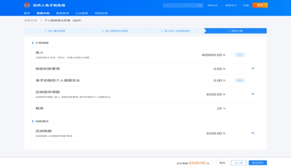 轉(zhuǎn)讓方申報(bào)的最后一個(gè)步驟,系統(tǒng)會(huì)自動(dòng)根據(jù)前三步的填報(bào)數(shù)據(jù),展示本次轉(zhuǎn)讓的計(jì)稅明細(xì)及需要繳納的個(gè)人所得稅。確認(rèn)無(wú)誤后點(diǎn)擊“提交資料”,股權(quán)轉(zhuǎn)讓信息就會(huì)提交至受讓方進(jìn)行核對(duì)。