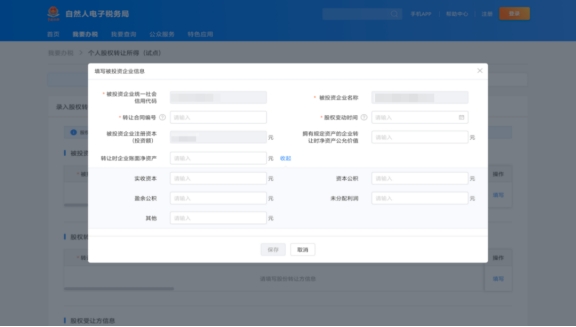 填寫(xiě)轉(zhuǎn)讓合同編號(hào)、股權(quán)變動(dòng)時(shí)間以及企業(yè)凈資產(chǎn)、實(shí)收資本、未分配利潤(rùn)等相關(guān)信息。填寫(xiě)完成后點(diǎn)擊“保存”,轉(zhuǎn)入下一步操作。