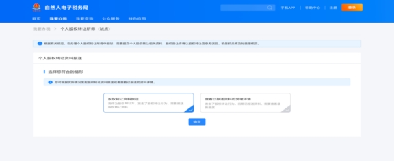 打開(kāi)自然人電子稅務(wù)局首頁(yè),使用個(gè)人所得稅APP掃碼或輸入賬號(hào)密碼的方式登錄,然后點(diǎn)擊“我要辦稅”-“稅費(fèi)申報(bào)”-“個(gè)人股權(quán)轉(zhuǎn)讓所得(試點(diǎn))”功能,進(jìn)入“股權(quán)轉(zhuǎn)讓資料報(bào)送”頁(yè)面。