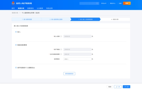 在錄入收入和扣除信息模塊,查看和錄入收入、稅前扣除費(fèi)用、準(zhǔn)予扣除的個(gè)人捐贈(zèng)支出相關(guān)信息,核實(shí)無(wú)誤后點(diǎn)擊下一步。