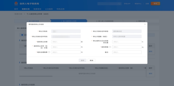 點(diǎn)擊“股權(quán)轉(zhuǎn)讓方信息”右側(cè)的“填寫(xiě)”,進(jìn)入填寫(xiě)頁(yè)面。填報(bào)股權(quán)轉(zhuǎn)讓份額、轉(zhuǎn)讓股權(quán)占企業(yè)總股份比重、股權(quán)轉(zhuǎn)讓合同價(jià)格、股權(quán)原值、相關(guān)合理稅費(fèi),填寫(xiě)完成后點(diǎn)擊“保存”,轉(zhuǎn)入下一步操作。